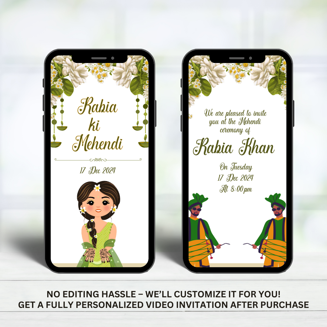 Invite your loved ones to join the fun with an energetic and colorful animated invitation that will set the perfect tone for your Mehndi or Dholki celebration!