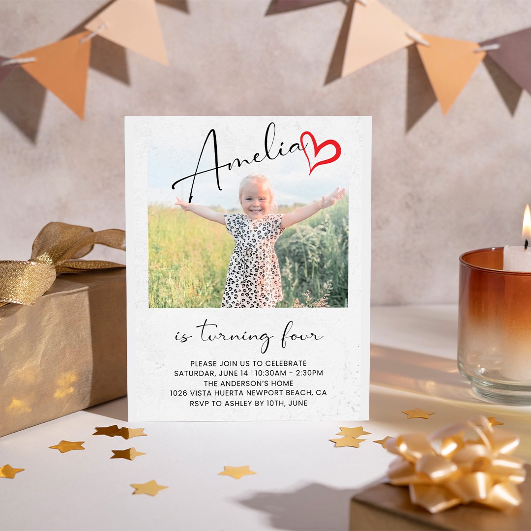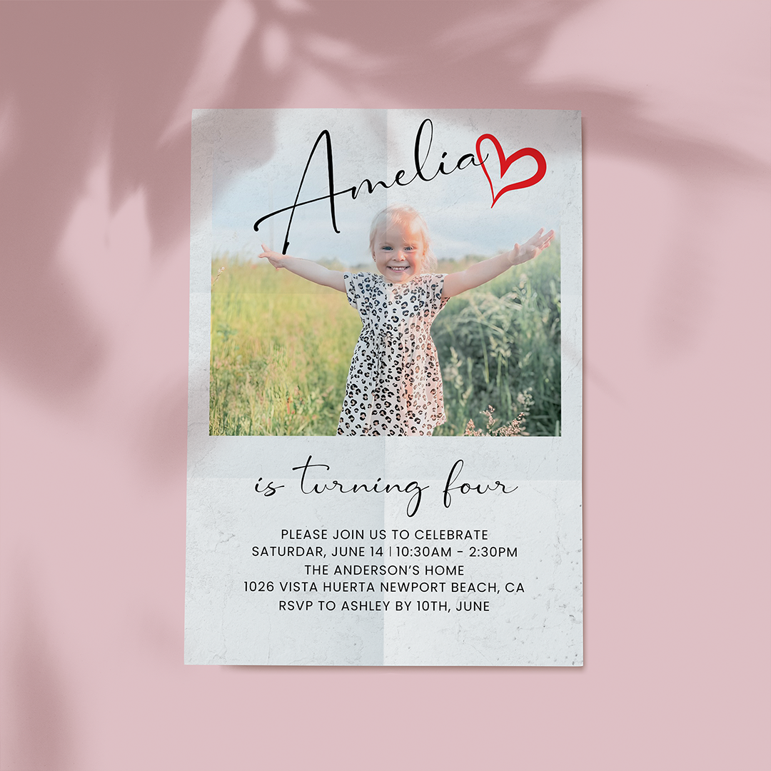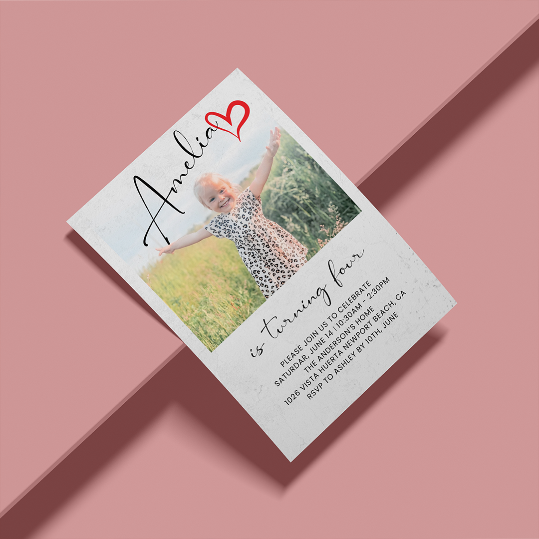 Custom Photo Card: Personalize with your child’s name, age, party details, and photo for a unique invitation.